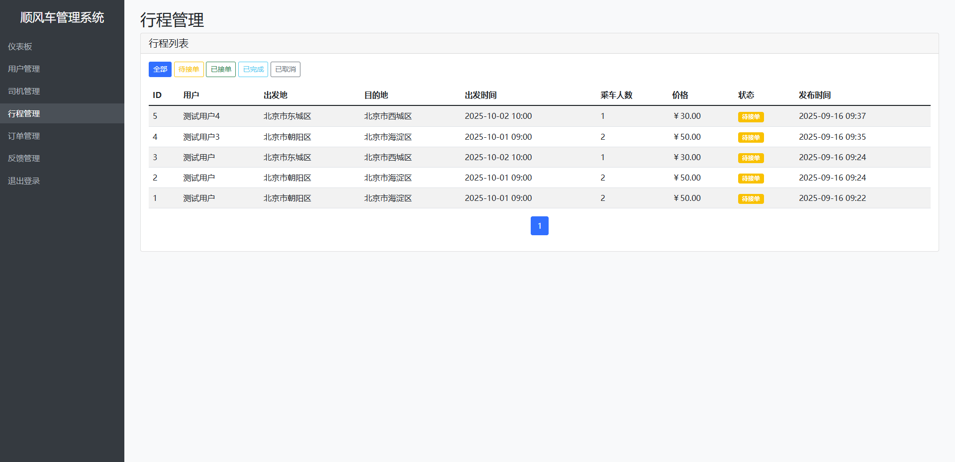 – 行程模块 (trip.py): 行程发布、列表、详情、订单管理